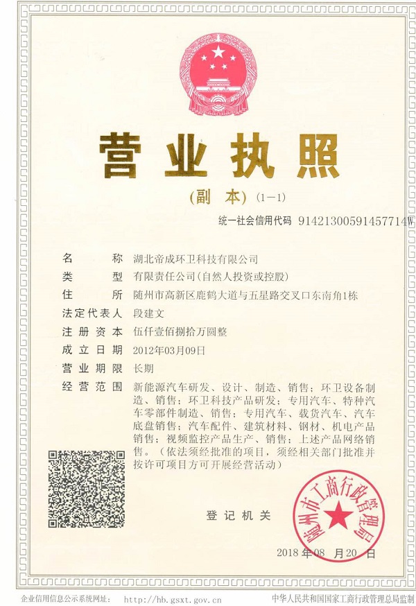 • 湖北帝成環(huán)衛(wèi)科技有限公司座落在中國專用汽車之都湖北隨州。隨州是歷史文化古城,炎帝神農(nóng)故里,編鐘古樂之鄉(xiāng),專用汽車之都。我司專業(yè)生產(chǎn)銷售各種垃圾車,包括勾臂式垃圾車、壓縮式垃圾車、新能源垃圾車、純電動垃圾車;吸糞車,吸污車,灑水車,高壓清洗車,清洗吸污車,污水處理車,霧炮車等各種環(huán)衛(wèi)車;道路清障車,平板運輸車,隨車起重運輸車,高空作業(yè)車,散裝飼料車,LED廣告車,水泥攪拌車,粉粒物料運輸車,客車校車等各種專用特種汽車。我司產(chǎn)品質(zhì)量可靠,技術先進,價格低廉,性價比和競爭力領先。愿隨時為您提供各種專用車咨詢和報價!歡迎隨時聯(lián)系垂詢!
