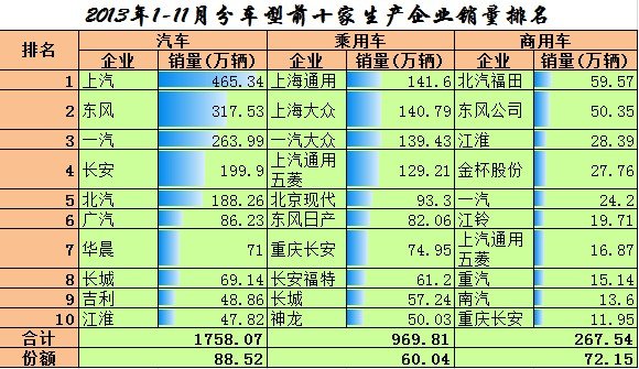 自主乘用車方面,長城撥得頭籌。商用車方面性價比較高的北汽福田和東風汽車名列前茅。這反映出我國的汽車市場還是以適用實惠為主,性價比為王。下面是前十一月的實際數據: