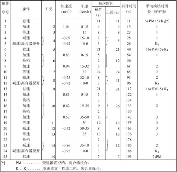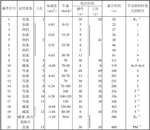 綜合工況油耗的測試具體駕駛規(guī)定要求如下,整個測試過程包括4個市區(qū)工況和1個市郊工況,測試完成后,便可以測得三個工況下的油耗。