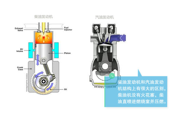 柴油發(fā)動機和汽油發(fā)動機結(jié)構(gòu)上有很大的區(qū)別,柴油機沒有火花塞,它吸入并壓縮空氣,然后將燃油直接噴入燃燒腔(直噴式)。其實是壓縮空氣產(chǎn)生的熱量點燃了柴油機的燃油。