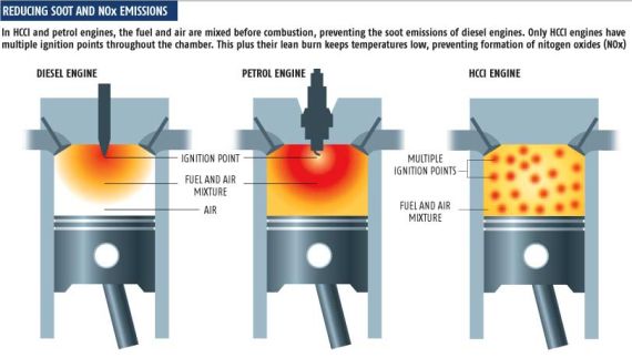 答案當然是NO,HCCI發(fā)動機這一種不倫不類的產(chǎn)物真的很奇怪,HCCI發(fā)動機使用汽油燃料,但是則使用壓燃的方式點火,通過活塞壓縮混合氣使之溫度升高至一定程度時自行燃燒。