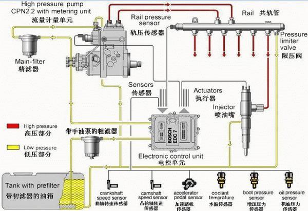 一、高壓共軌技術(shù)讓燃燒更充分,提高燃油利用率。高壓共軌是將噴油泵和共軌系統(tǒng)連接,保證共軌管道及其連接的噴油嘴保持穩(wěn)定高壓(約1600帕),燃油電控系統(tǒng)單獨(dú)控制噴油嘴開(kāi)啟和關(guān)閉,確保在最正確時(shí)間點(diǎn)四個(gè)噴油嘴提供完全相同的油壓,以及精確的噴油量,極大提高發(fā)動(dòng)機(jī)的工作效率。