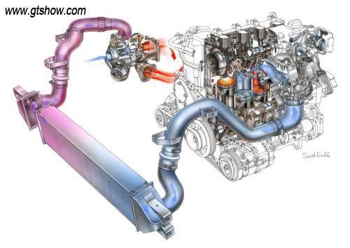 二、增壓中冷技術(shù)改善燃燒的另一要素——氧氣的利用率,增大進(jìn)氣量,有助于減少?gòu)U氣排放和提高燃油經(jīng)濟(jì)性。增壓中冷(又稱中冷增壓)是由增壓器和中冷系統(tǒng)組成。通過(guò)利用發(fā)動(dòng)機(jī)排出的廢氣慣性沖力來(lái)推動(dòng)渦輪室內(nèi)的渦輪,渦輪有帶動(dòng)同軸的葉輪,葉輪壓送由空氣濾清器送來(lái)的空氣,使之增壓進(jìn)入氣缸。當(dāng)發(fā)動(dòng)機(jī)轉(zhuǎn)速增快,廢氣加速排出,帶動(dòng)渦輪轉(zhuǎn)速增快,葉輪就壓縮更多的空氣進(jìn)入氣缸,形成同步協(xié)調(diào)作用,最終增加發(fā)動(dòng)機(jī)的輸出功率。