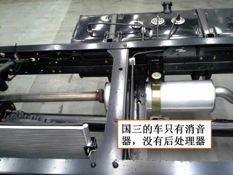 四、找DOC+POC后處理系統(tǒng)。這是最容易辨識(shí)的標(biāo)志,只需要蹲下來(lái)從車底看排氣管上是否有兩個(gè)柱形罐狀裝置。國(guó)III車只有一個(gè),即消音器;而國(guó)IV車則有兩個(gè),其一為消音器,另一為DOC+POC后處理系統(tǒng)。