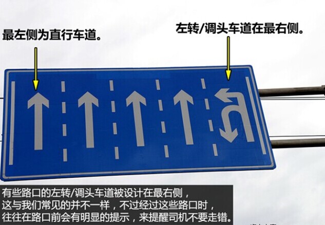 大多數(shù)左轉(zhuǎn)/調(diào)頭的車道都會在最左側(cè)車道,而有少數(shù)左轉(zhuǎn)/調(diào)頭車道會被安排在最右側(cè)車道,這可能是為了避免左轉(zhuǎn)/調(diào)頭車輛與直行車輛發(fā)生事故,或該路段較窄,調(diào)頭車輛不能順暢的通過而這樣設計的。