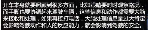 據(jù)統(tǒng)計部門稱,目前有7成左右的交通事故皆因某一方駕駛員分神而導致。在開車時使用手機的司機剎車反應速度要慢19%,尤其是當司機騰出手撥打手機或者視線偏離正前方時,難以掌控方向盤以應對轉(zhuǎn)彎或者路線變化,極易引發(fā)交通事故。此前新交規(guī)也明確:司機駕駛機動車有撥打、接聽手持電話等妨礙安全駕駛的行為,一次記2分,處20元以上200元以下罰款。