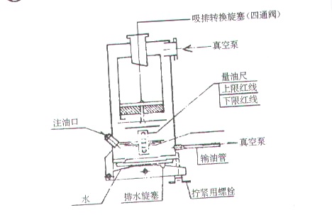 分離的機(jī)油重新作業(yè)真空泵潤(rùn)滑油使用,但分離出的水會(huì)貯留在箱底,如油色彎白,會(huì)降低潤(rùn)滑性和氣密性。因此應(yīng)定期清掃內(nèi)部、更換機(jī)油、油量在真空度約96千帕?xí)r補(bǔ)充到量油尺下中間刻線,使用HT-40#機(jī)械油,每月清掃一次內(nèi)部。