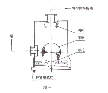它是萬一當(dāng)罐內(nèi)滿量自動(dòng)停吸裝置發(fā)生故障時(shí),為防止污水進(jìn)入泵內(nèi)面自動(dòng)工作的裝置,雙重保護(hù)。吸入油分較多的污泥,則易侵蝕球座和球,故要定期更換。另外,作業(yè)時(shí)容易積存污水,所以作業(yè)結(jié)束后一定要排水和清掃浮球,并定期更換浮球。(見圖三)