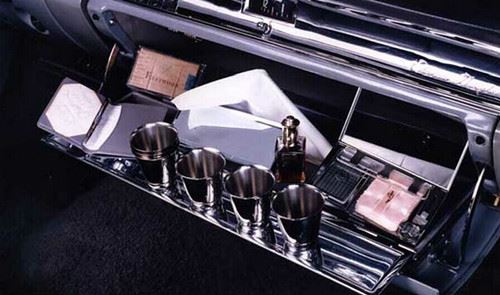 對(duì)于男士而言,車內(nèi)小小的點(diǎn)煙器十分貼心,但你還沒見過更貼心的??纯?957款凱迪拉克Eldorado Brougham,它的手套箱被布置成了一個(gè)迷你酒吧!開車?yán)哿?來杯威士忌解解乏吧。