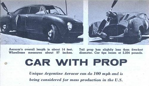 看看這輛誕生于1955年誕生的Argentine Aerocar,從前面看它和普通車型沒多大區(qū)別,但他的尾部卻長(zhǎng)了一個(gè)碩大的螺旋槳。資料顯示,這輛車極速高達(dá)100英里/時(shí),相當(dāng)于160公里/時(shí)的速度。