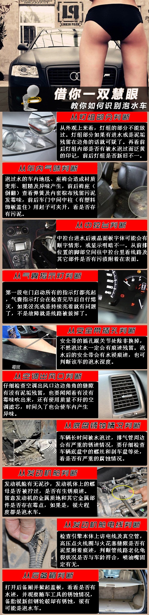 最近這些年氣候惡化,經(jīng)常出現(xiàn)“水浸街”的現(xiàn)象。每年各地都會(huì)出現(xiàn)很多“泡水車(chē)”。不管是吸污車(chē)吸糞車(chē)還是灑水車(chē)?yán)?chē)等環(huán)衛(wèi)車(chē)乃至小轎車(chē)客車(chē),泡過(guò)水自然都會(huì)對(duì)質(zhì)量有所影響。對(duì)電路,金屬防銹等部分,油路水路氣路,發(fā)動(dòng)機(jī)變速箱等密封都會(huì)有一定影響,當(dāng)然也會(huì)影響到二手吸污車(chē)等二手車(chē)的價(jià)值。那么怎么分辨“泡水車(chē)”,讓您買(mǎi)二手車(chē)不吃虧呢?吸污車(chē)廠家一張圖教您巧識(shí)別。