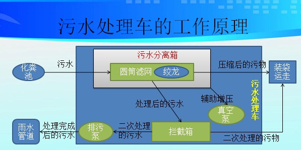 •作業(yè)時(shí)將化糞池的污物吸到污水箱中,污水箱中安裝有無軸螺旋、圓筒濾網(wǎng),可將固態(tài)污物過濾出來并壓縮,液態(tài)污水經(jīng)過攔截箱后被排污泵排出。