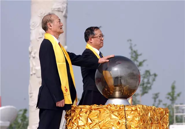 中華炎黃文化研究會副會長王俊義(右)、中國佛教協(xié)會副會長凈慧法師(左)、中國道教協(xié)會會長任法融道長(中)為世界華人祈福