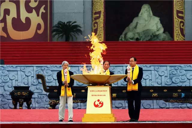中國社會科學(xué)院學(xué)部委員劉慶柱、首屆全國道德模范吳天祥、美國佐治亞州立大學(xué)孔子學(xué)院院長顧寶桐共同點燃圣火盆;