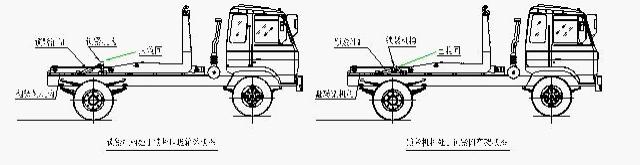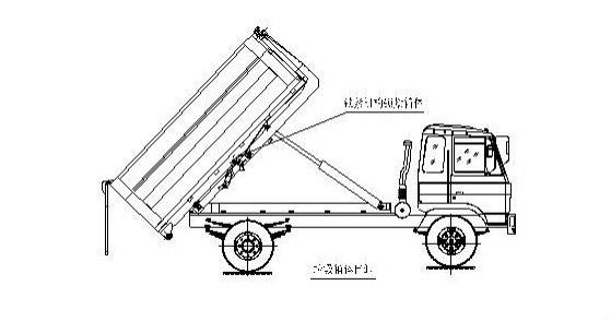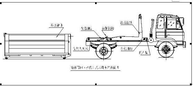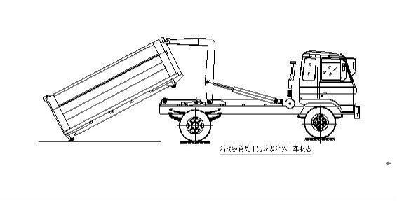 該車是由汽車底盤、拉臂主油缸、附車架、翻轉(zhuǎn)架、支撐腿(選裝)、鎖緊架、鎖緊油缸及多路換向閥等組成。翻轉(zhuǎn)架一端連在附車架上,其另一端設(shè)有活動拉臂,中間安裝有鎖緊系統(tǒng);活動臂油缸一端連在活動臂上,另一端連接在附車架上;鎖緊機(jī)構(gòu)通過鎖緊油缸的動作可以在箱體自卸時(shí)將附車架上的箱體與翻轉(zhuǎn)架及拉臂連為一體,在主油缸伸出時(shí)形成自卸角,也可以通過鎖緊油缸的收回把翻轉(zhuǎn)架與附車架鎖緊為一體,利用主油缸的收回或伸出使活動拉臂將地下的垃圾箱拖拉至附車架上或從附車架上放回到地面。
