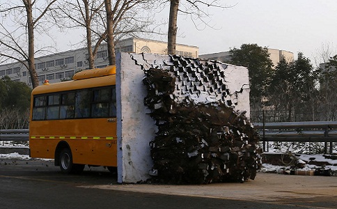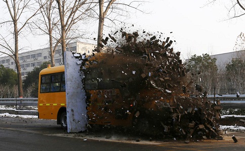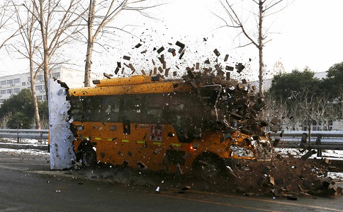 2015年11月27日,鄭州舉辦校車安全質(zhì)量檢測(cè)。起步、加速、飛馳、撞!“嘭”的一聲巨響之后,磚土橫飛,校車從中穿越而出。