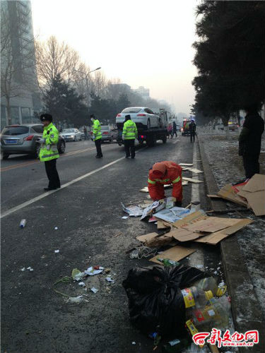 新文化記者趕到現(xiàn)場時,肇事的轎車已被拖到拖車上,被撞的手推車也固定在了拖車上。距離拖車不遠的路面上,散落著大量紙殼、木板等物,一名環(huán)衛(wèi)工人正在收拾,幾名交警在維持附近的交通。