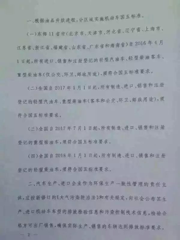 (二)全國自2017年1月1日起,所有制造、進口、銷售和注冊登記的輕型汽油車、重型柴油車(客車和公交、環(huán)衛(wèi)、郵政用途),須符合國五標(biāo)準(zhǔn)要求。
