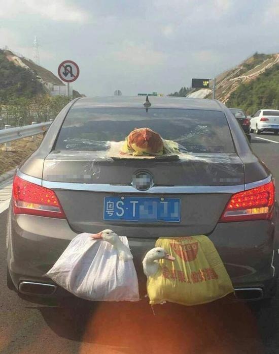 最新微信朋友圈一輛東莞牌照的別克君威火了:被稱為后置發(fā)凍雞和雙渦輪增鴨。畫面極具喜感:轎車的車尾吊著兩只鴨,后蓋上還趴著一只雞……這組照片迅速引起關(guān)注,還創(chuàng)造了“帶著雞鴨跑高速”的話題。先來(lái)看看網(wǎng)友貼出的圖片: