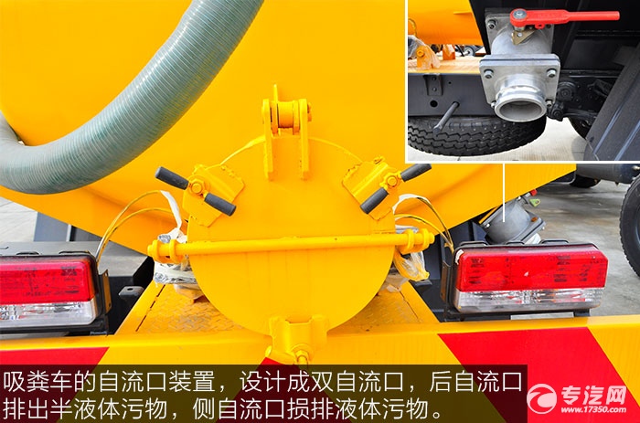 吸糞車的自流口裝置,設計成雙自流口,后自流口排出半液體污物,側(cè)自流口損排液體污物,使排污方式更加靈活起來。