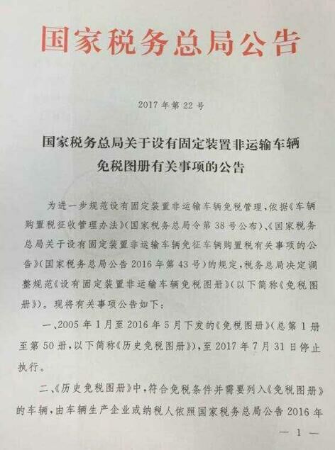 依據(jù)《中華人民共和國車輛購置稅暫行條例》和《車輛購置稅征收管理辦法》(國家稅務(wù)總局令第33號公布,國家稅務(wù)總局令第38號修改),現(xiàn)將設(shè)有固定裝置非運(yùn)輸車輛免征車輛購置稅有關(guān)事項(xiàng)公告如下: