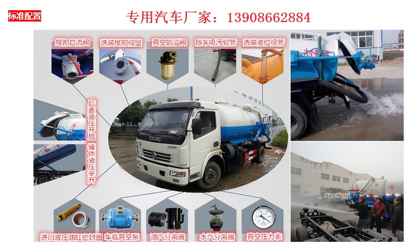 吸污車主要配置及功能:吸污車專用部分由取力器、傳動軸、真空吸污泵、壓力罐體、液壓部分,管網(wǎng)系統(tǒng)、真空壓力表、視糞窗、洗手裝置等組成,隨車配置大功率真空吸污泵和優(yōu)質(zhì)液壓系統(tǒng),罐體封頭一次壓鑄成型、罐體可后開、雙頂自卸。罐內(nèi)污物可通過后蓋直接傾倒,具有真空度高(比吸糞車的吸力更大)、噸位大、效率高、用途更廣泛的特點。
