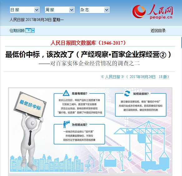 人民日報繼5月31日之后,如此短時間內(nèi),罕見的再一次談"最低價中標"問題:《最低價中標,該改改了!》。制造業(yè)工程質量因此問題頻發(fā),使得整個行業(yè)屢屢蒙羞的同時,也在給業(yè)內(nèi)人士敲響警鐘:“最低價中標”原則一天不變,行業(yè)就很難有什么工匠精神,更不要說什么中國品牌!”