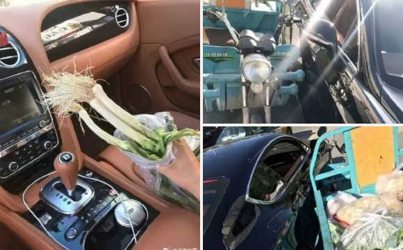 這輛黑色的賓利車在路上被一輛三輪車撞了,大爺?shù)狼福盒』镒樱屹r償你吧,一把蔥行嗎?賓利車主答復(fù):不用了,下次您慢點騎。最后,大爺還是從副駕車窗扔進(jìn)來一袋蔥…