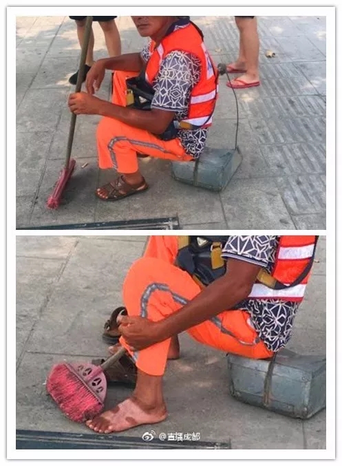 2017年7月29日,成都室外常有40度的高溫,炎熱無比!網(wǎng)友在動(dòng)物園附近拍到一位環(huán)衛(wèi)工人大爺,借著工作間隙在樹蔭下休息。整個(gè)人都被曬黑,當(dāng)然脫下涼鞋后,看的更讓人心酸…