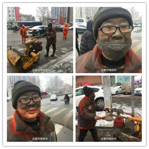 2017年2月22日,山東濟(jì)南。一位環(huán)衛(wèi)工人的臉上沾滿了機(jī)器噴出來的灰色水漬。他身上的橙色環(huán)衛(wèi)工服,也完全看不出原來的樣子。他們凌晨2點(diǎn)多就到街頭清理積雪,一直持續(xù)到8點(diǎn),連口水都沒喝。