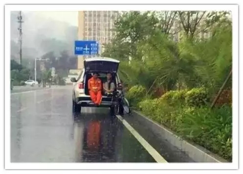 13這是路過司機(jī)拍下的一幕:廣東珠海突降暴雨,一名環(huán)衛(wèi)工無處避雨。民警張先生駕車經(jīng)過,他停下車,對(duì)環(huán)衛(wèi)工說:“快上車,我送你回去”?!安恍校疫€沒有掃完路,而且單車也放不進(jìn)去”。于是出現(xiàn)這一幕:張先生打開后尾箱蓋,陪著他一起避雨……