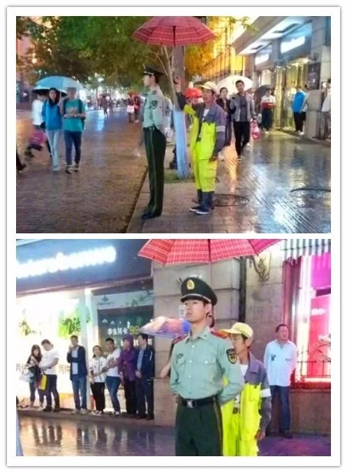 14哈爾濱中央大街上,一名武警戰(zhàn)士在路邊站崗,突然降下大雨。行人紛紛避雨或撐起雨具,這時(shí)一名環(huán)衛(wèi)工人,出現(xiàn)在了武警戰(zhàn)士的身后,伸長手臂,把雨傘打在了他的頭頂?;蛟S,戰(zhàn)士已經(jīng)在雨中站了很長時(shí)間;或許,環(huán)衛(wèi)大哥已經(jīng)勞累了一整天。