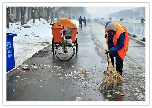17據(jù)央視報(bào)道,我國目前環(huán)衛(wèi)工中有八成為臨時(shí)工,他們的工資不到全國城鎮(zhèn)在崗職工月平均工資的一半。2012年12月28日,河南省遂平縣建設(shè)路,78歲的張秀榮在冰天雪地里打掃衛(wèi)生。她從1976年就開始做環(huán)衛(wèi)工,已經(jīng)干了36年,一直都是臨時(shí)工身份,沒有社保和醫(yī)保。