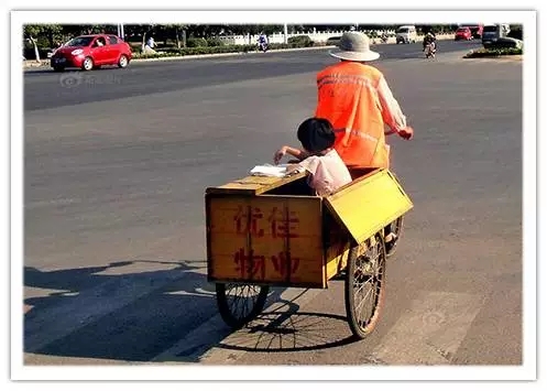 2012年6月19日下午4時(shí)許,在江蘇省徐州市銅山新區(qū)北京路上,一位年邁的環(huán)衛(wèi)工人騎著環(huán)衛(wèi)車外出工作,自己的小孫女蝸盤在環(huán)衛(wèi)車?yán)飳懽鳂I(yè)。
