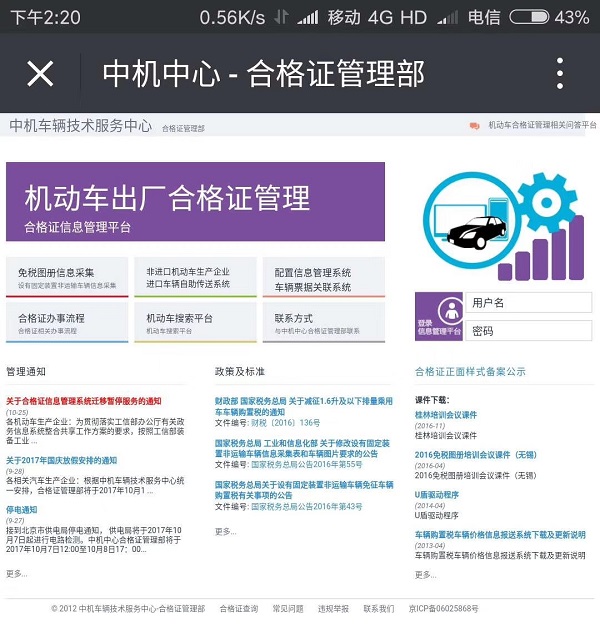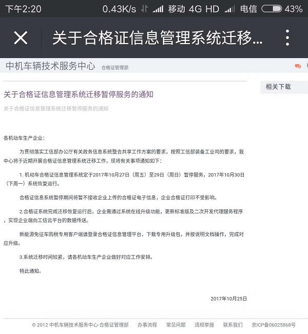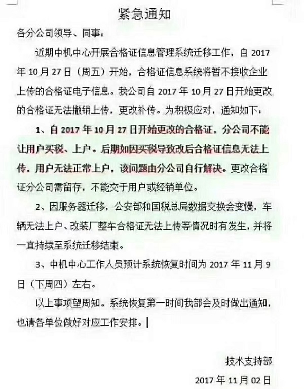 10月25日國家車輛合格證管理機(jī)構(gòu)-中機(jī)中心發(fā)布通知系統(tǒng)升級。預(yù)計在11月9日完成系統(tǒng)升級,此期間車輛無法上戶、改裝廠整車合格證無法上傳等情況會時有發(fā)生。