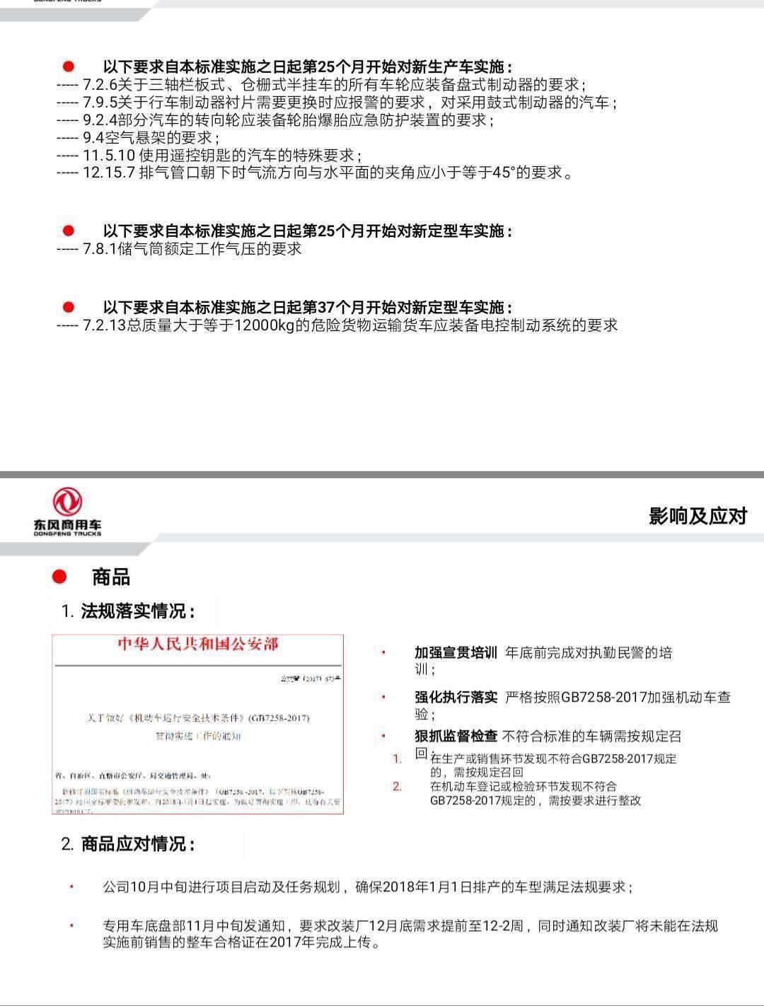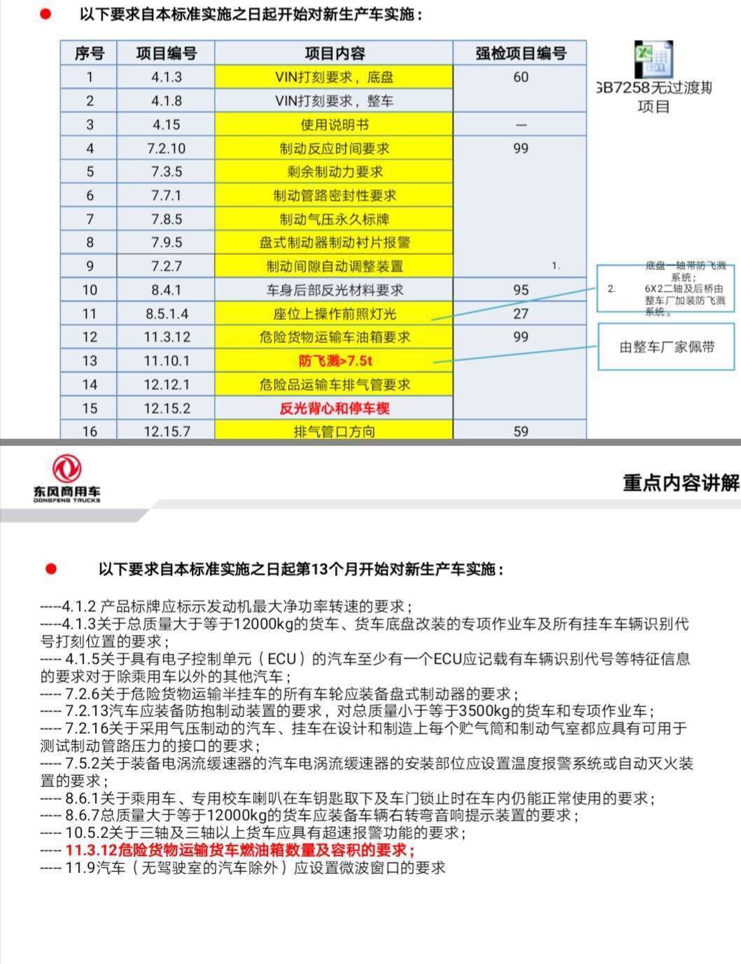 由于新GB7258-2017在2018.1.1起開始實(shí)施,法規(guī)要求所有車型需增加VIN打刻要求、防飛濺系統(tǒng)、剎車自動(dòng)調(diào)整臂、前照燈高度調(diào)整裝置、儲(chǔ)氣筒氣壓標(biāo)牌、制動(dòng)襯片更換報(bào)警裝置(危險(xiǎn)品車輛)、反光背心和停車楔等,倉柵車要求蓬桿焊死!