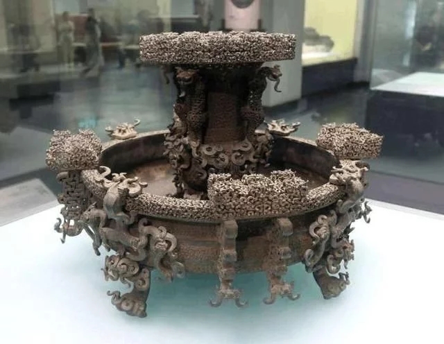 2002年,國(guó)家文物局規(guī)定了第一批具有非常高歷史價(jià)值的珍貴文物孤品為永久禁止出境展覽文物,這件1978年由軍隊(duì)率先發(fā)現(xiàn)的曾侯乙墓出土的戰(zhàn)國(guó)青銅尊盤以其獨(dú)特的藝術(shù)魅力,巨高的歷史價(jià)值,以及現(xiàn)代科學(xué)無(wú)法復(fù)制高超技藝而被列在第29名!