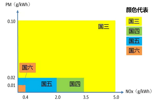 柴油機(jī)穩(wěn)態(tài)工況(ESC/WHSC)國三到國六排放最主要污染物NOx與PM限值對(duì)比圖: