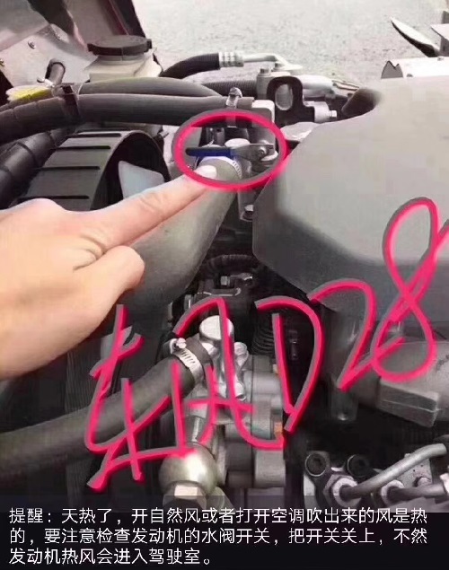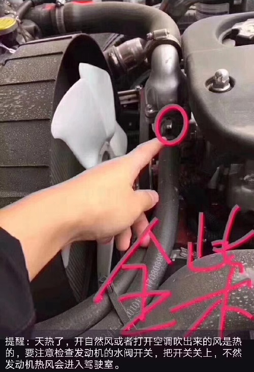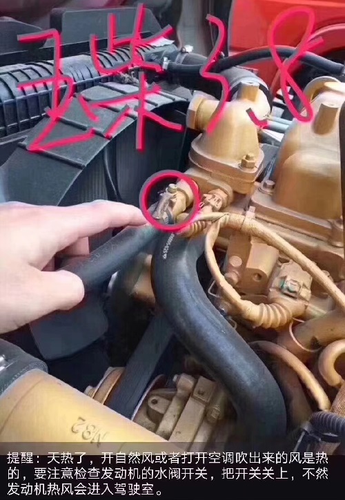 其他品牌發(fā)動機上一般也會有類似的閥門,各位可以檢查一下,夏天的時候關閉(手柄和管路垂直)可以防止熱風循環(huán)到駕駛室內(nèi),冬天的時候一定要開啟(手柄和管路平行),這樣駕駛室內(nèi)才能有暖風。