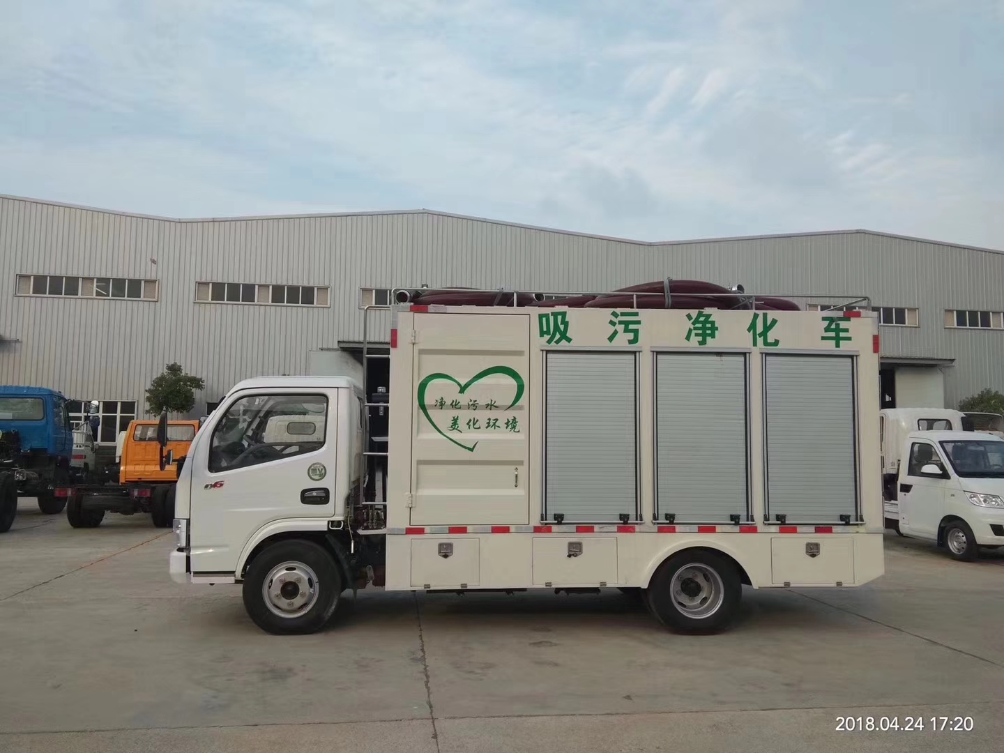 新型吸污凈化車(chē),采用東風(fēng)多利卡國(guó)五底盤(pán),裝有副發(fā)動(dòng)機(jī),污泥螺桿泵(德國(guó)進(jìn)口泵,電機(jī)(日本進(jìn)口))全自動(dòng)藥物箱,半自動(dòng)藥物箱,電控箱,污水分離箱、疊螺脫水機(jī)等。