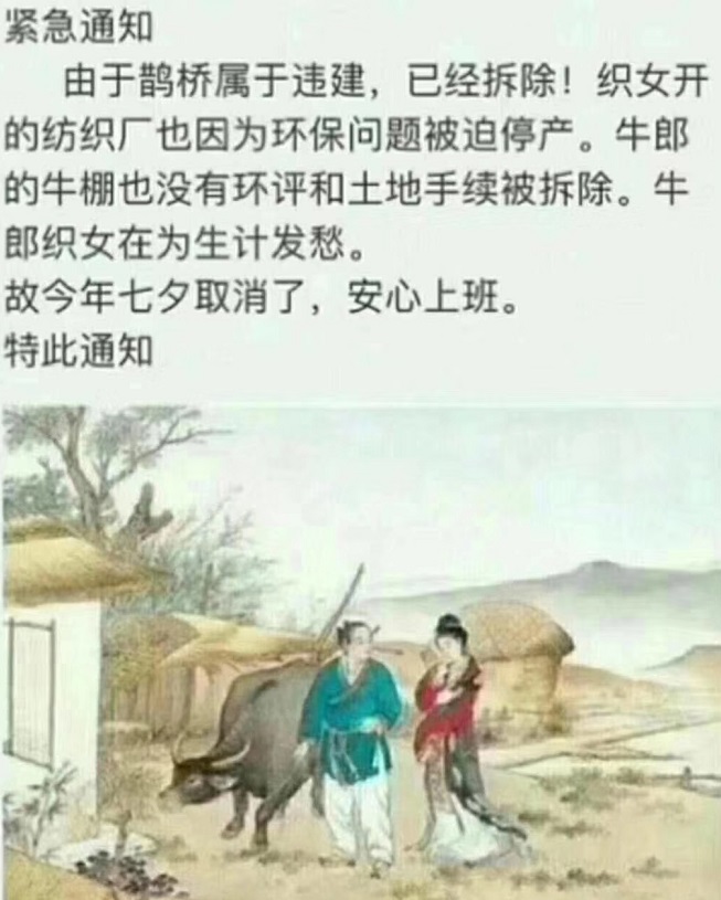 今天是所謂的“中國(guó)情人節(jié)”,農(nóng)歷七月初七,是七夕節(jié),又名乞巧節(jié)、七巧節(jié)、雙七、香日、星期、蘭夜、女兒節(jié) [1] 或七姐誕等。 “七夕”最早來(lái)源于人們對(duì)自然天象的崇拜。早在《詩(shī)經(jīng)》時(shí)代,人們就對(duì)牛郎織女的天象有所認(rèn)識(shí),在東漢時(shí)就出現(xiàn)了人格化的描寫:“織女七夕當(dāng)渡河,使鵲為橋。”