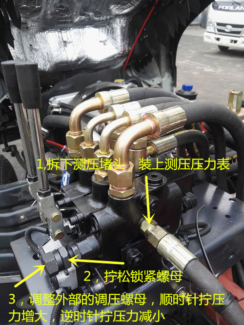 4,操作主臂缸的控制閥操作手柄,讓油缸伸縮幾個回合后,再操作控制閥手柄讓主油缸完全縮回,此時不要松開操作手柄,讓油缸一直處于縮回狀態(tài),此時用22mm叉子搬手調(diào)整調(diào)壓閥的螺壓螺母,順時針調(diào),壓力增大,逆時針調(diào),壓力減小,調(diào)到壓力為12Mpa時,松開控制閥的操作手柄,再逆時針旋轉(zhuǎn)擰緊調(diào)壓閥的鎖緊螺母,到此,調(diào)壓完成。再將主油伸出300-500mm,給調(diào)節(jié)行程開關(guān)留出空間。