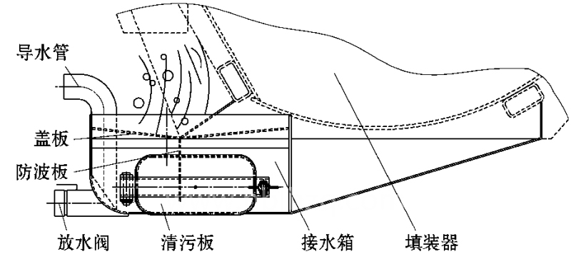 器與車廂產(chǎn)生微小間隙 ,造成密封部分失效。特別是在車輛使用一段時(shí)間后 , 膠條易產(chǎn)生疲勞 , 彈性小 ,有可能使密封完全失效。為防止污水撒漏 ,增加了接水裝置并不斷加以完善 ( 圖 6) : 為確保撒漏的污水被接住 ,接水面積要盡可能大 ;為防止接住的污水產(chǎn)生飛濺 ,適當(dāng)增加箱體周圍高度 ;為防車輛制動(dòng)與轉(zhuǎn)彎時(shí)污水因慣性被拋出 ,采取了接水蓋板與箱體滿焊的形式 ,并使漏水孔避開(kāi)周邊一定距離 ,還增設(shè)防波板 ,以防止水的竄出 ;為使填裝器舉升時(shí)水能自動(dòng)流出 ,設(shè)置了導(dǎo)水管 ;在考慮到汽車離地間隙及不改變汽車離去角的情況下 ,最大限度的增大接水箱容積 ;為使混進(jìn)接水箱中的細(xì)小垃圾易排出 ,箱體后部采用斜面形式 ; 接水箱垃圾清污門(mén)接觸面由面接觸改為線接觸 ,密封件為球頭形式 ,受力均勻 ,絕對(duì)不漏水(已申請(qǐng)專利) ,如圖 7 、圖 8 。