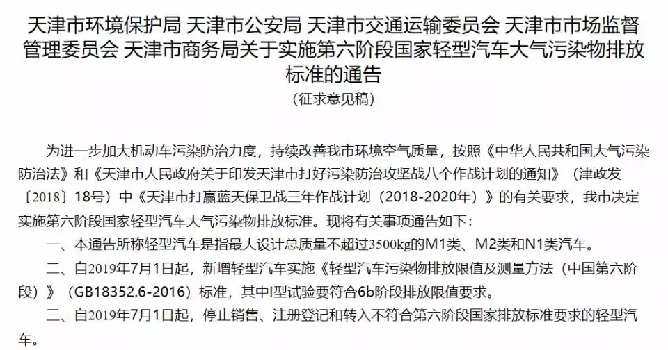 天津:11月28日,天津市環(huán)保局、公安局等多部委聯(lián)合發(fā)布了有關(guān)“國六”政策的《征求意見稿》,意見指出:“國六”排放標(biāo)準(zhǔn)計(jì)劃自2019年7月1日起實(shí)施,但該通告目前仍處于意見征集階段,這意味著天津?qū)嵤皣辈粫缬?019年7月1日。
