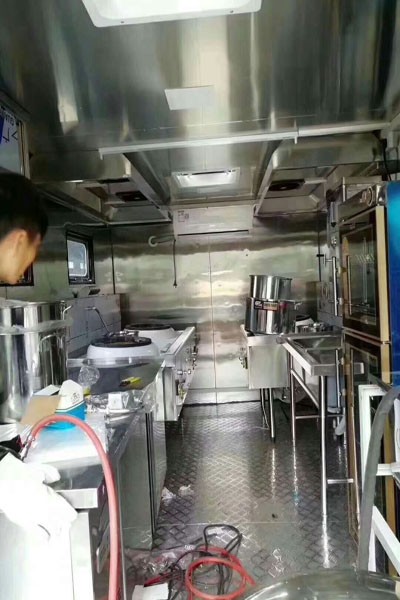 車內(nèi)采光通風(fēng)車廂配有門,五道窗(其中有四道活動窗),一套吸油煙機。車停放時,可將全部門窗打開通風(fēng)。車在行進中,可將抽排油煙機打開排氣,另外,頂換氣扇即可進氣又可排氣;車側(cè)面四道窗都為鋼化玻璃窗,可滿足白天的自然采光。另外車內(nèi)頂有兩盞頂燈,抽排油煙機上有照明燈,可滿足車內(nèi)操作照明。