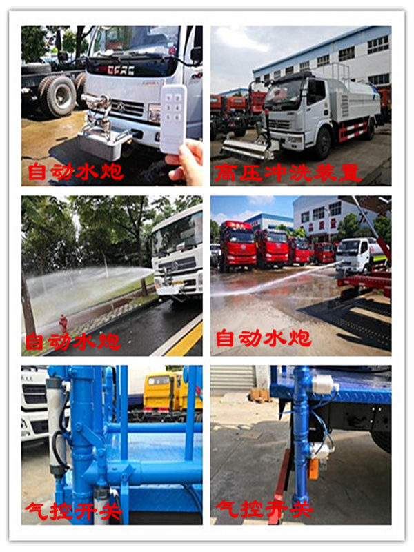 灑水車可加裝配置:噴霧機(jī),弧形噴嘴,箭頭燈,自動(dòng)控制,自動(dòng)水炮,高壓沖洗裝置等。