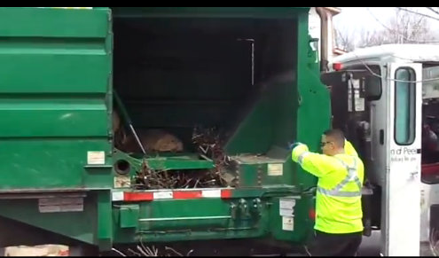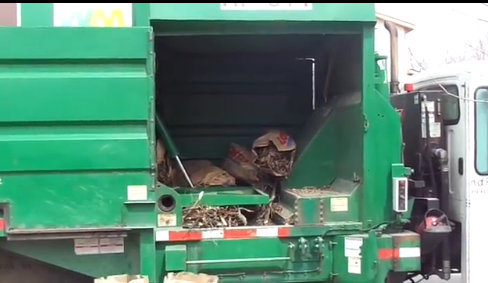 從視頻中可以看出,垃圾車(chē)的掛桶已經(jīng)變成了垃圾槽,并且被分成了兩部分,一部分裝載可回收垃圾,另一部分裝載不可回收垃圾。同樣通過(guò)舉升裝置,將兩部分的垃圾分別倒入同一垃圾車(chē)的不同區(qū)域。
