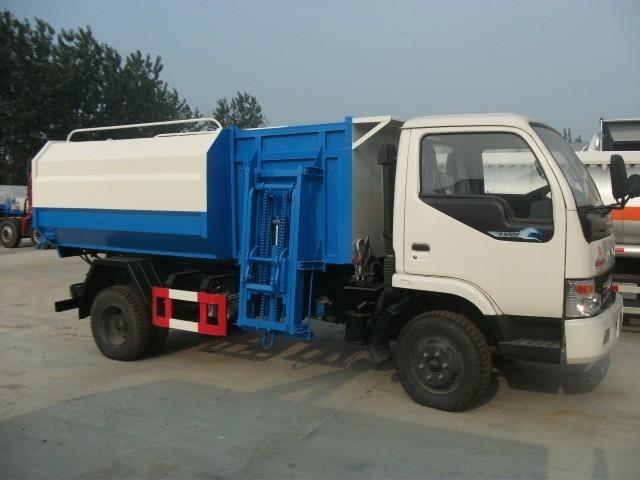 做掛桶式自裝卸垃圾車時(shí)垃圾斗容積為5立方米。垃圾箱頂部封閉,頂部前端開口裝上掛桶提升機(jī)構(gòu)。這次根據(jù)客戶要求,采用液壓式自動(dòng)提升翻轉(zhuǎn)機(jī)構(gòu),所有操作集成在駕駛室一次完成,不用下車操作。進(jìn)一步簡化了操作流程。以下是此款車做成常規(guī)掛桶式自裝卸垃圾車時(shí)的照片: