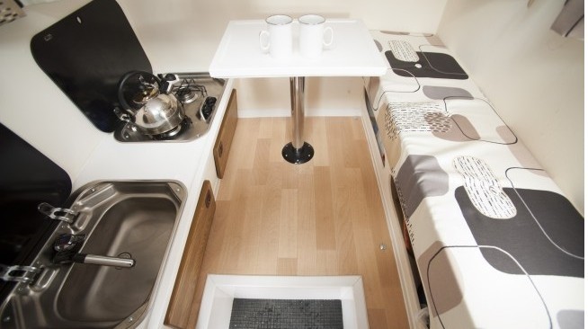 車內(nèi)有水槽,龍頭,燃?xì)庠?,餐桌和沙發(fā)。餐桌可以當(dāng)作書桌使用,沙發(fā)可以當(dāng)作單人床使用。